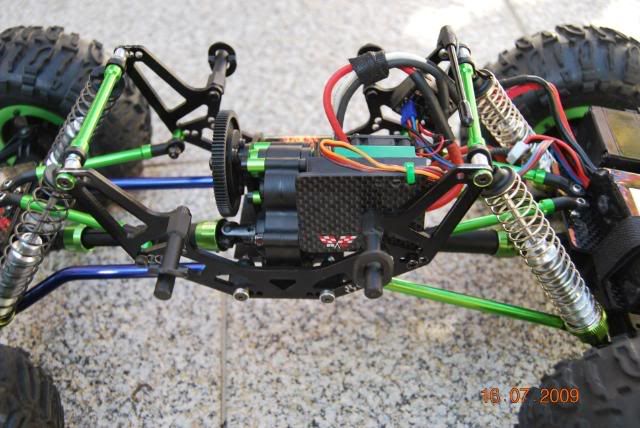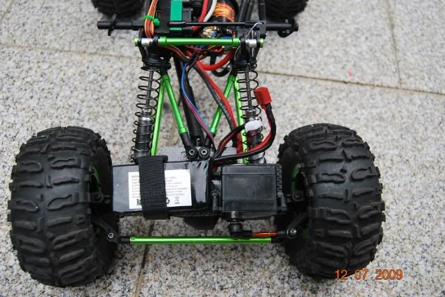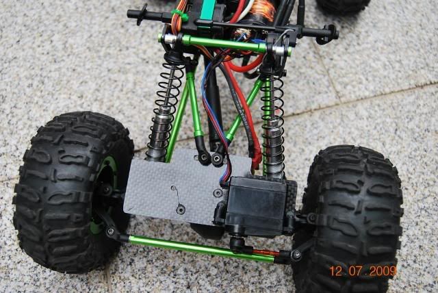 - Optei por fazer outra dianteira mas maior e modificada tambem para ter 4 links mas o servo foi recolocado de forma a permitir a colocação de um lipo de 1500mah 30c de 11,1v iguais as que são usadas no aviões e helis , muito baratas e até agora estou bastante satisfeito com a compra , recordo apenas que nem todos os variadores / motores admitem 11,1v