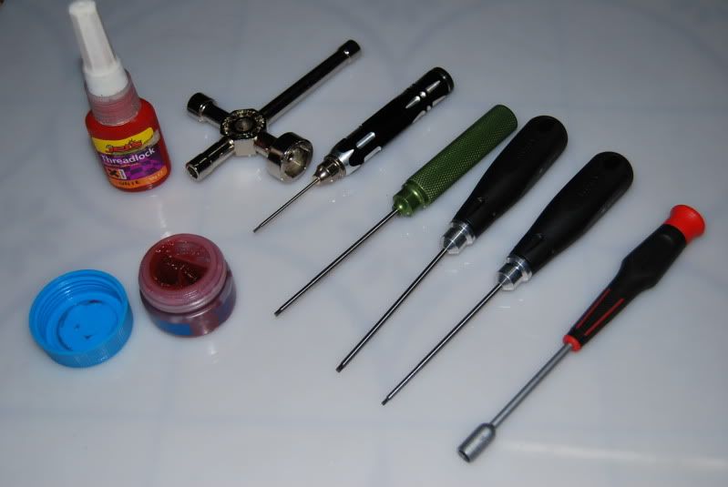Antes de mais convem lembrar que o a losi teima em colocar parafusos e porcas com medidas imperiais pelo que para se poder trabalhar neste chassis vai precisar de um jogo de chaves sextavadas 050", 1/16", 5/64", 3/32" , uma chave de porcas 1/4 , precisa ainda de massa consistente maritima , uma chave de porcas normal de 7mm para retirar as jantes , treadlock ( de preferência azul ) e um conjunto de pinhões para o motor que convém pelo menos ir do 12 aos 18 dentes para se poder experimentar a melhor relação conforme o motor uilizado.