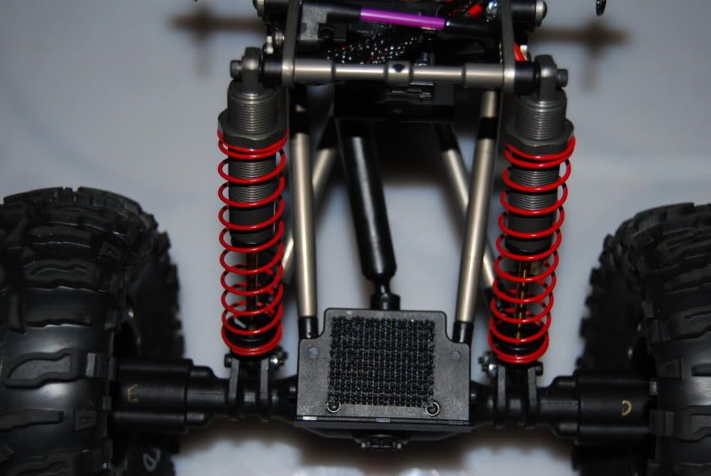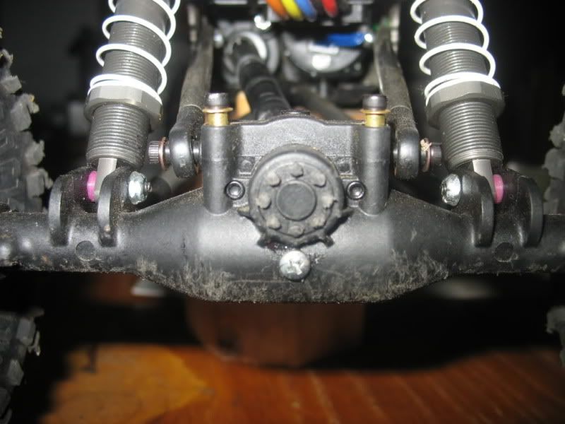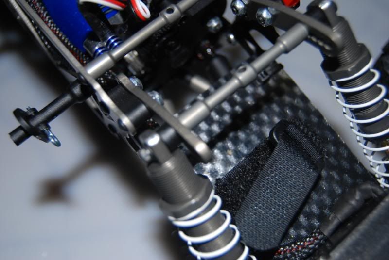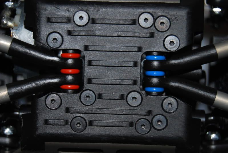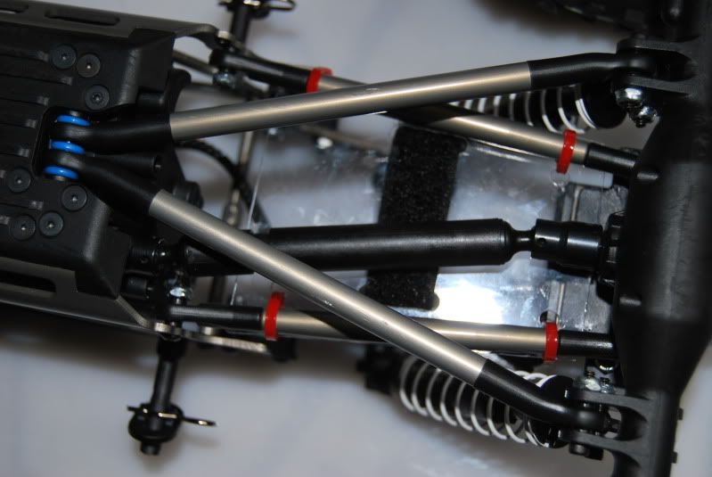 Temos então agora um carro minimamente rodado mas convem fazer ainda uma coisa antes de montar a electrónica , os links debaixo do chassis tem tendencia para sair do lugar pelo que se podem colocar uns o-rings de borracha ( usei os de origem dos amortecedores do axial ax10 atrás e outros idênticos a frente ) para os manter no sitio .