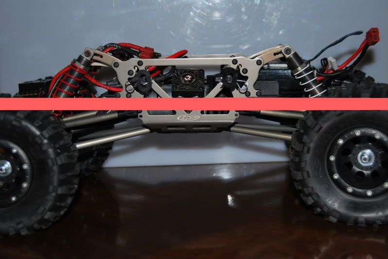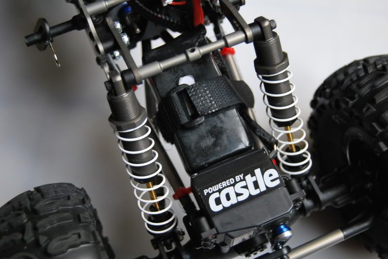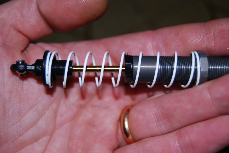 O lcc vem já com uns belíssimos amortecedores em alumínio , uma das coisas que me fez logo alguma impressão foi o facto de virem equipados com 4 molas extremamente macias à frente e atrás , à frente pareceu-me bem mas atrás e apesar de não haver aqui torque twist interessa-nos a partida que a traseira mantenha a frente no chão e acalme um pouco a excessiva articulação geral do chassis, pouca gente muda as molas de origem o que me faz pensar se estarei certo por isso substituí as traseiras com umas molas vermelhas da traxxas que são apenas ligeiramente mais duras , a traseira ficou muito mais suave apenas como se tivesse colocado um oleo mais pesado e deixei estar as brancas de origem da losi à frente para já mantendo o oleo 35wt de origem mas adicionei uns espaçadores de cerca de 10mm de forma a limitar um pouco a articulação e evitar que o eixo de transmissão vá de encontro no compartimento da bateria e aos tirantes .