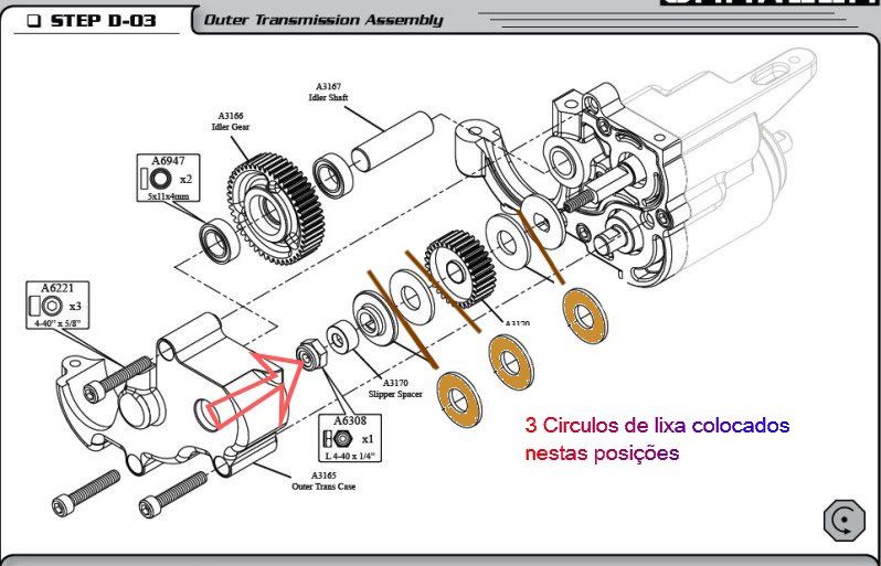 A embraiagem no lcc não é regulável , tem tendência para ficar solta e a dar problemas pelo que se aconselha a resolver esse problema logo antes de andar com o carro , o que fiz foi eliminar o efeito da embraiagem bloqueando-a com pequenos círculos de lixa que encaixei depois de os furar com um furador de papel , tenho pena de não ter fotos mas na altura pensei que não funcionasse , para isso é obrigatório comprar um upgrade , um suporte de alumínio para o motor , já que com o torque a que toda a transmissão vai estar sujeita sem embraiagem faz com que o suporte de plástico se mova e o motor saia do sitio danificando a cremalheira .